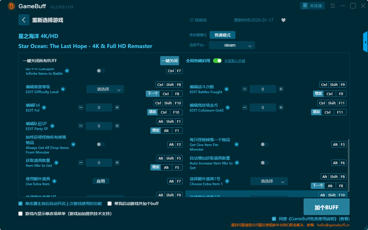 星之海洋4KHD三十一项修改器是一款操作极其简单的游戏辅助修改器工具,功能强大实用,可自由一键设置拥有无限生命、一击必杀、特定伤害值、经验倍率、敌人永不冲锋、战斗经验倍率、最大奖励面板、无限战斗魔法值、队友无法死亡、编辑战斗次数、获取道具数量、编辑难度等级等三十一项功能,感兴趣的玩家不要错过哦!
