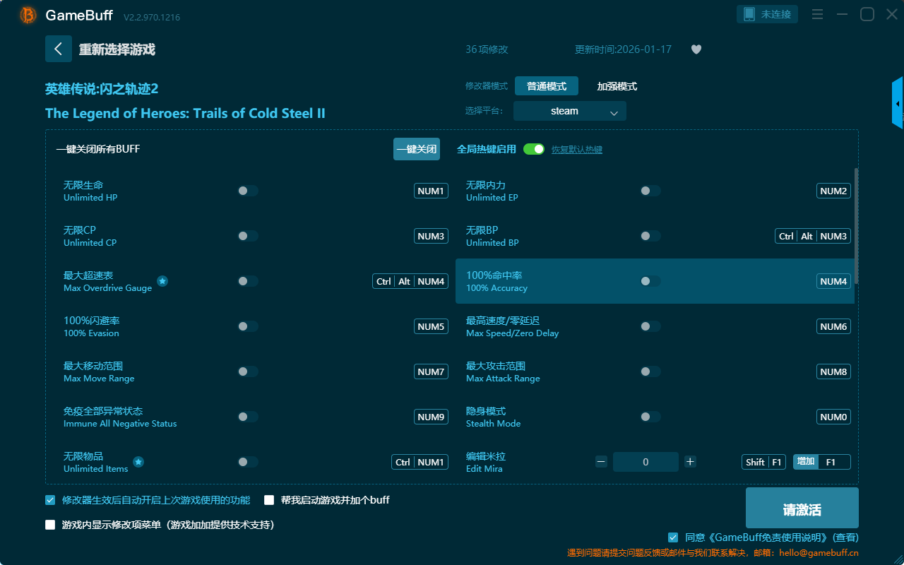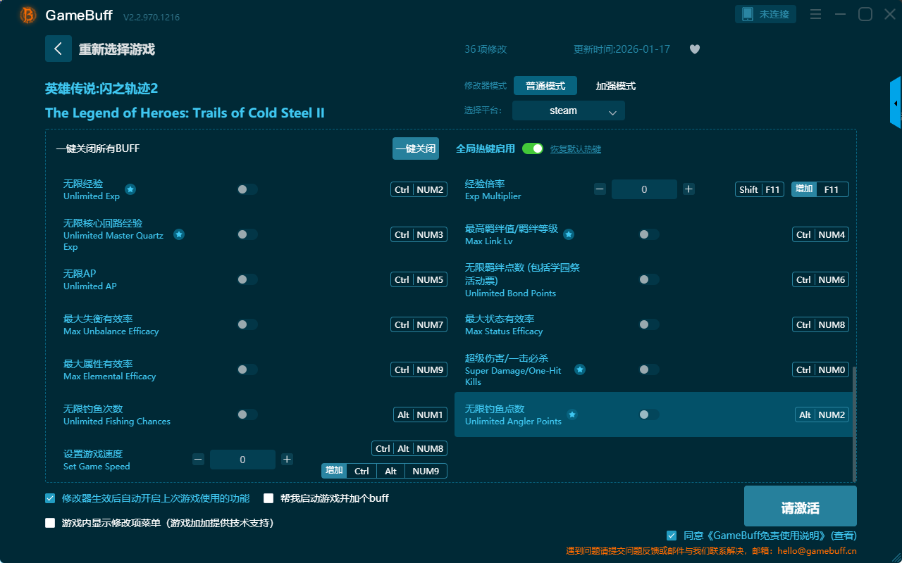 英雄传说闪之轨迹2三十六项修改器是一款功能强大实用的游戏辅助修改器工具,操作极其简单,可一键设置拥有无限经验、经验倍率、无限核心回路经验、无限AP、无限钓鱼次数、一击必杀、超级伤害、设置游戏速度、无限生命、无限CP、最大超速表、最大移动范围、无限BP、无限内力等三十六项功能内容,感兴趣的玩家快来本站下载体验一下吧!