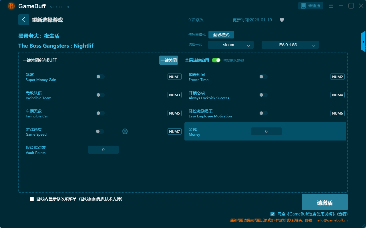 黑帮大佬:夜生活九项修改器是一款操作极其简单的游戏辅助修改器工具,根据本身在游戏中遇到的困难自由设置拥有暴富、无敌队伍、车辆无敌、游戏速度、保险库点数、锁定时间、开锁必成、轻松激励员工、金钱等九项功能内容,感兴趣的玩家千万不要错过哦!