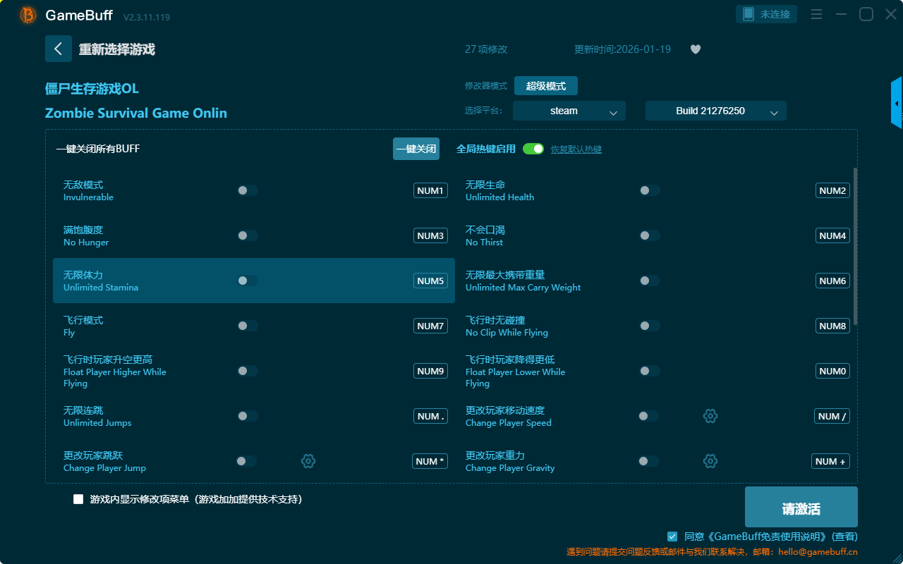 僵尸生存游戏OL二十七项修改器是一款功能强大的游戏辅助修改器工具,可一键设置拥有无敌模式、满饱腹度、不会口渴、无限生命、无限最大携带重量、无限体力、飞行模式、飞行时无碰撞、更改玩家重力、更改玩家跳跃、无限连跳、飞行时玩家升空更高、游戏速度、保存位置插槽1、保存位置插槽3、保存位置插槽5等二十七项功能内容,感兴趣的玩家不要错过哦!