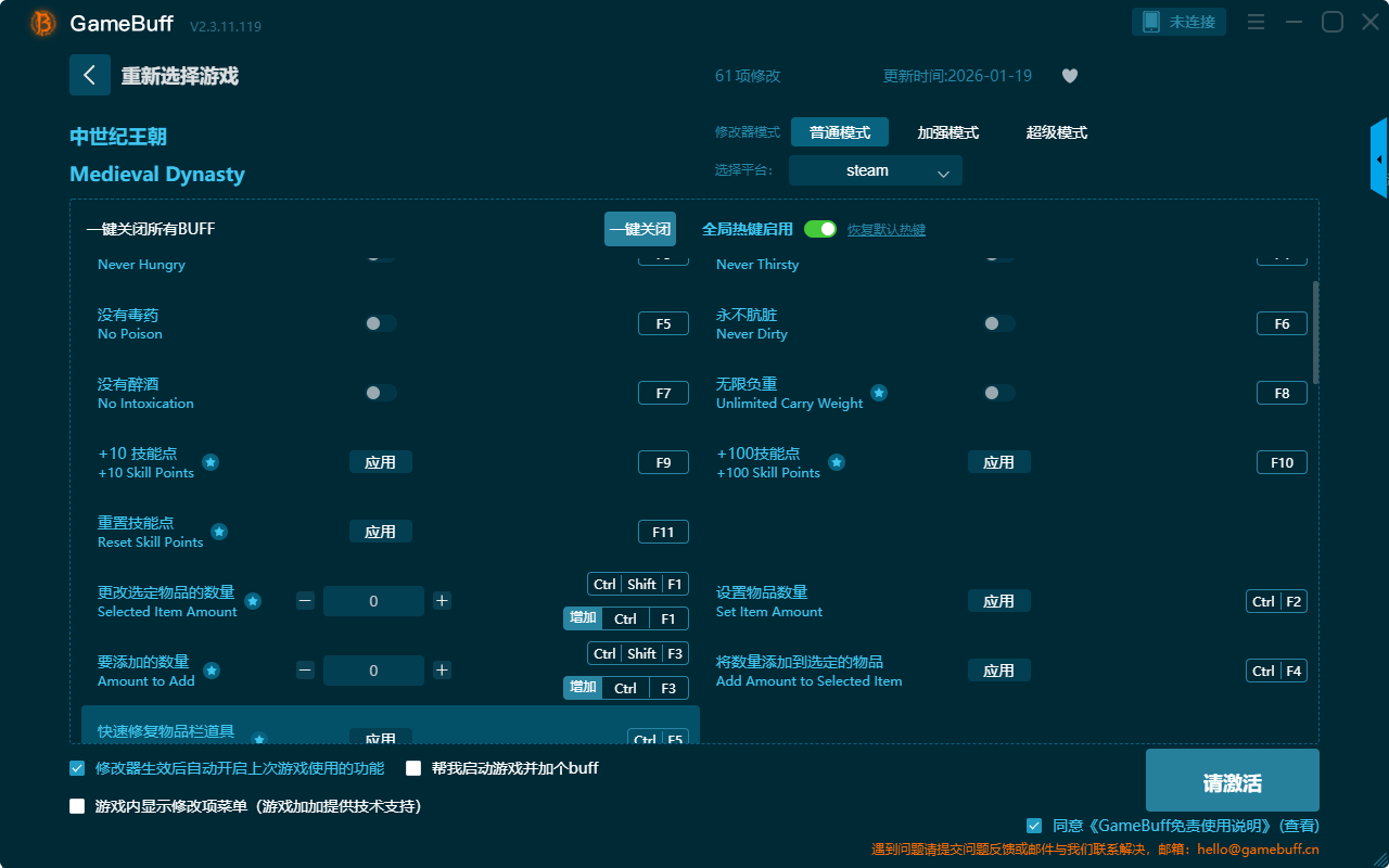 中世纪王朝六十一项修改器是一款功能强大的游戏辅助修改器工具,操作十分简单,根据本身的需求一键设置拥有无限生命、无限体力、永不口渴、永不肮脏、无限负重、没有醉酒、没有毒药、重置技能点、更改选定物品的数量、设置物品数量、+100技能点、+10技能、一击必杀、快速合成、瞬间建造等六十一项功能内容,感兴趣的玩家千万不要错过哦!