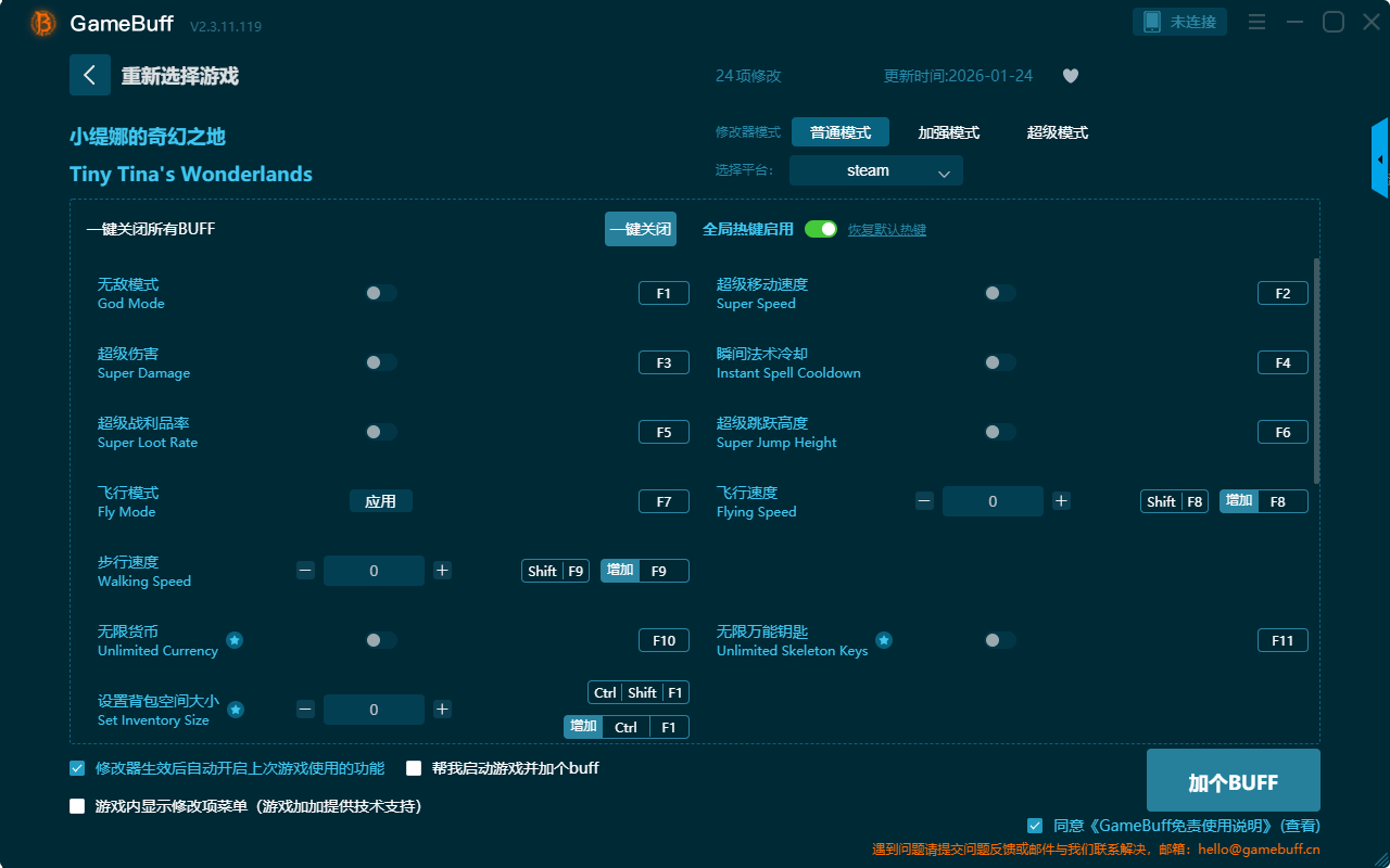 小缇娜的奇幻之地二十四项修改器是一款操作极其简单的游戏辅助工具,自由设置拥有无敌模式、超级移动速度、瞬间法术冷却、超级跳跃高度、飞行速度、无限万能钥匙、飞行模式、步行速度、无限货币、设置背包空间大小、超级战利品率、超级伤害、无后坐力、武器不扩散等二十四项功能内容,感兴趣的玩家千万不要错过哦!