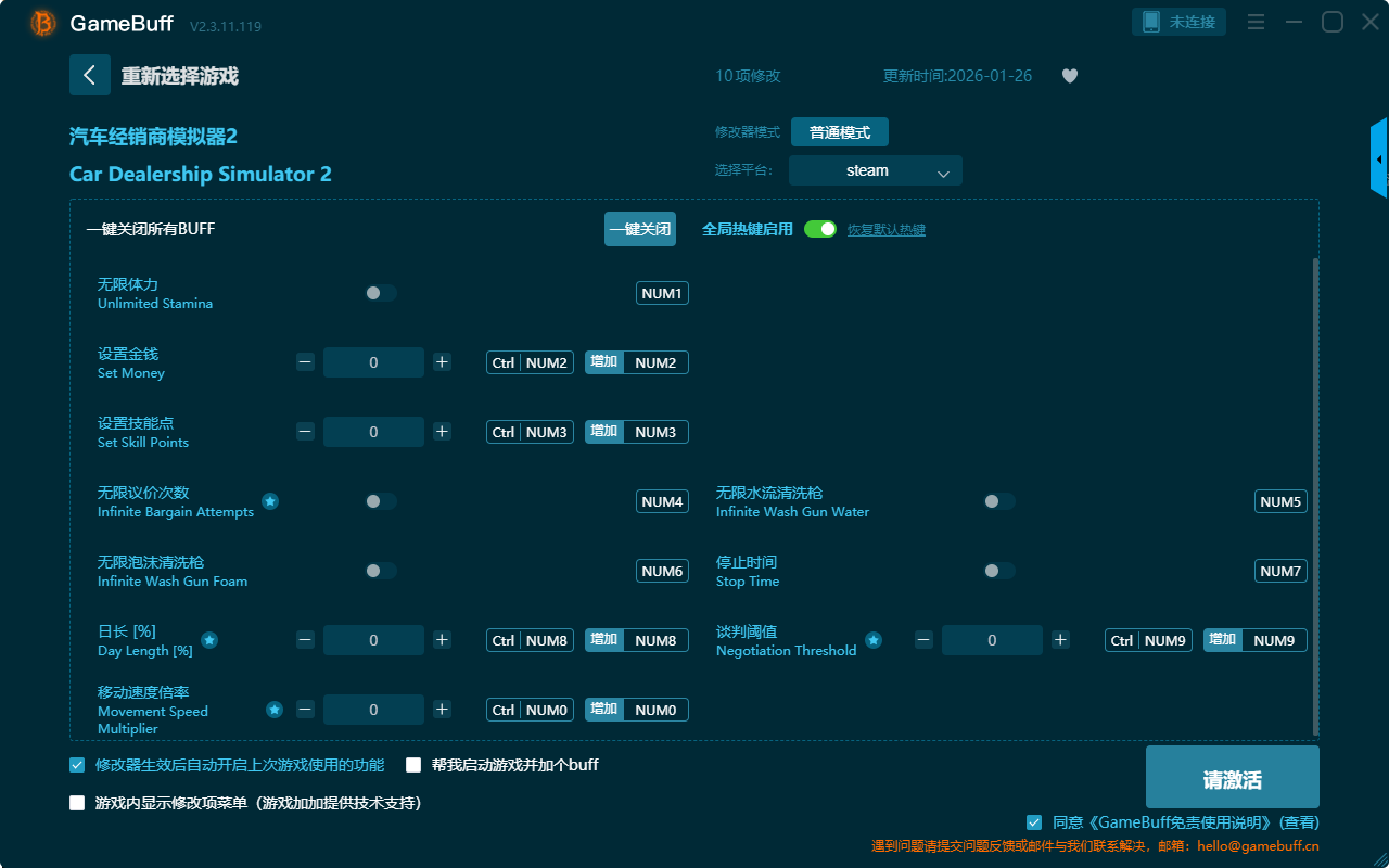 汽车经销商模拟器2十项修改器是一款操作极其简单的游戏辅助修改器工具,功能强大实用可一键设置拥有无限体力、停止时间、无限泡沫清洗枪、日长、移动速度倍率、设置技能点、设置金钱、无限议价次数等十项功能内容,感兴趣的玩家快来当游网下载体验一下吧!