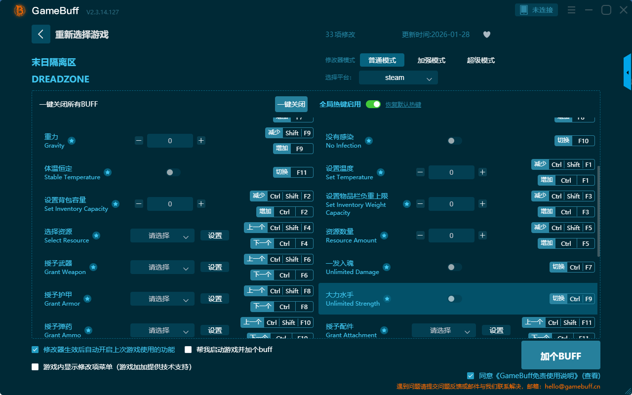 末日隔离区三十三项修改器是一款功能强大实用的游戏辅助修改器工具,操作极其简单,可一键设置拥有无限生命、无限跳跃、无限水、移动速度、跳跃高度、没有感染、设置温度、设置物品栏、负重上限、体温恒定、重力、设置背包容量、冲刺速度、更改时间、注射坦克、立即制作、保存当前位置、动物攻击、授予弹药、授予蓝图、授予配件等三十三项功能内容,感兴趣的玩家不要错过哦!