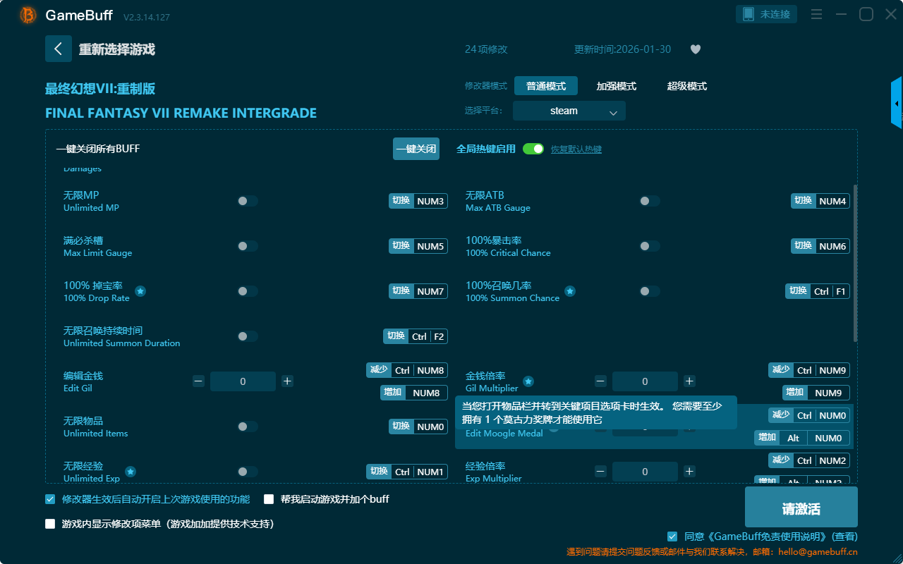最终幻想7:重制版二十四项修改器是一款功能强大的游戏辅助修改器工具,可自由设置拥有无限生命、无限ATB、无限MP、编辑金钱、无限物品、金钱倍率、编辑莫古力奖牌、100%召唤几率、100%暴击率、100%掉宝率、一击必杀、超级伤害、一击破防等二十四项功能内容,感兴趣的玩家不要错过哦!