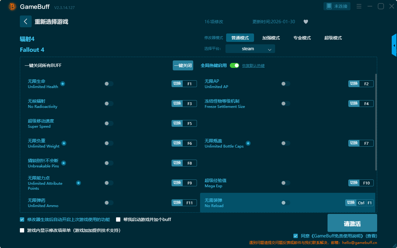 辐射4十六项修改器是一款功能强大的游戏辅助GameBuff工具,根据本身在游戏中遇到的困难与挑战自由设置拥有无限生命、无限AP、无核辐射、无限负重、无限瓶盖、超级经验值、无需装弹、无限弹药、无限能力点、冻结怪物等级机制、快速合成、飞行模式等十六项功能内容,感兴趣的玩家千万不要错过哦!