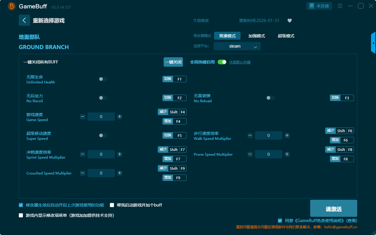 地面部队九项修改器是一款可以自由设置拥有无限生命、无后坐力、游戏速度、超级移动速度、冲刺速度倍率、步行速度倍率、无需装弹、无限弹药等九项功能内容的游戏辅助修改器工具,操作十分简单易上手,感兴趣的朋友不要错过哦!