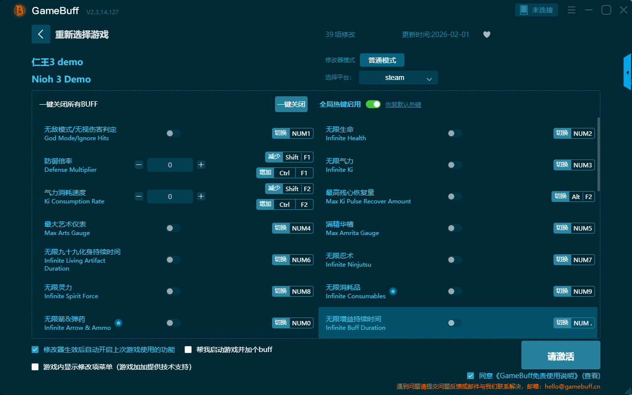 仁王3三十九项修改器是一款功能强大实用的游戏辅助修改器工具,操作十分简单,可根据本身的需求一键设置拥有无敌模式、防御倍率、无限生命、无限忍术、无限灵力、无视伤害判定、无限气力、无限武功、编辑精华、精华倍数、编辑仓库物品数量、编辑锻造材料数量等三十九项功能内容,感兴趣的玩家千万不要错过哦!