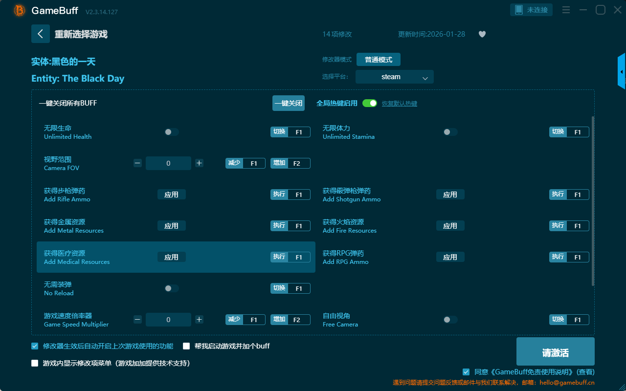 实体:黑色的一天十四项修改器是一款操作极其简单的游戏辅助修改器工具,可根据本身遇到的困难自由设置拥有无限生命、视野范围、获取步枪弹药、获取金属资源、获取医疗资源、无需装弹、无限体力、游戏速度倍率器、获取RPG弹药、获取火焰资源、自由视角、活动雾弹枪弹药、高清截图等十四项功能内容,感兴趣的玩家千万不要错过哦!