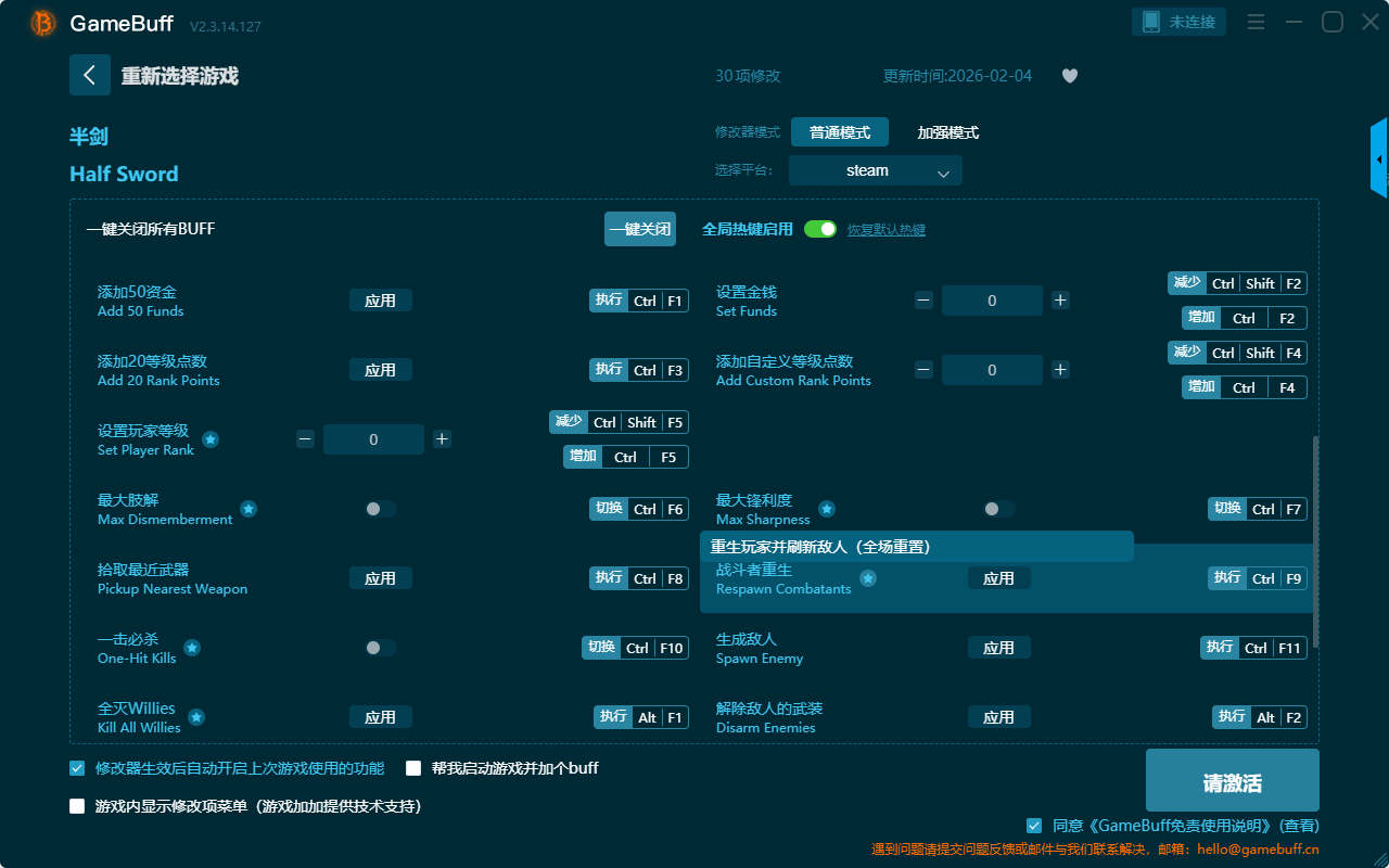 半剑三十项修改器是一款功能强大的游戏辅助修改器工具,可一键设置拥有无敌模式、无限体力、无限弹药、一击必杀、耐力消耗速度、玩家伤害减半、疾跑向前、设置金钱、冲刺强化、添加50资金、敌人伤害倍增、硬核模式、生成敌人、冻结敌人、赢得比赛、卸除敌人护甲等三十项功能内容,感兴趣的玩家不要错过哦!