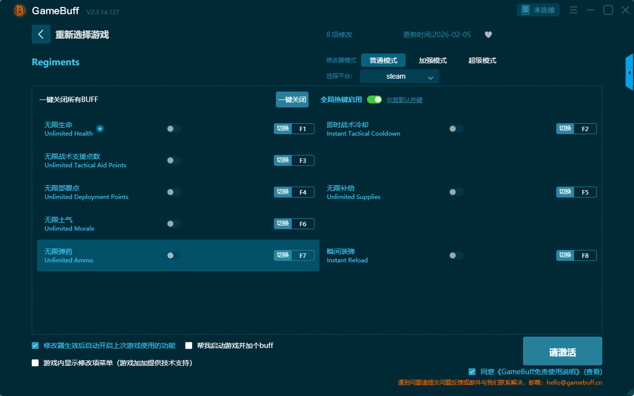 Regiments八项修改器是一款功能强大的游戏辅助GameBuff工具,操作极其简单,可一键设置拥有无限生命、即时战术冷却、无限补给、瞬间装弹、无限士气、无限弹药、无限部署点、无限战术支援点数等八项功能内容,沉浸式享受游戏带来的乐趣,感兴趣的玩家不要错过哦!