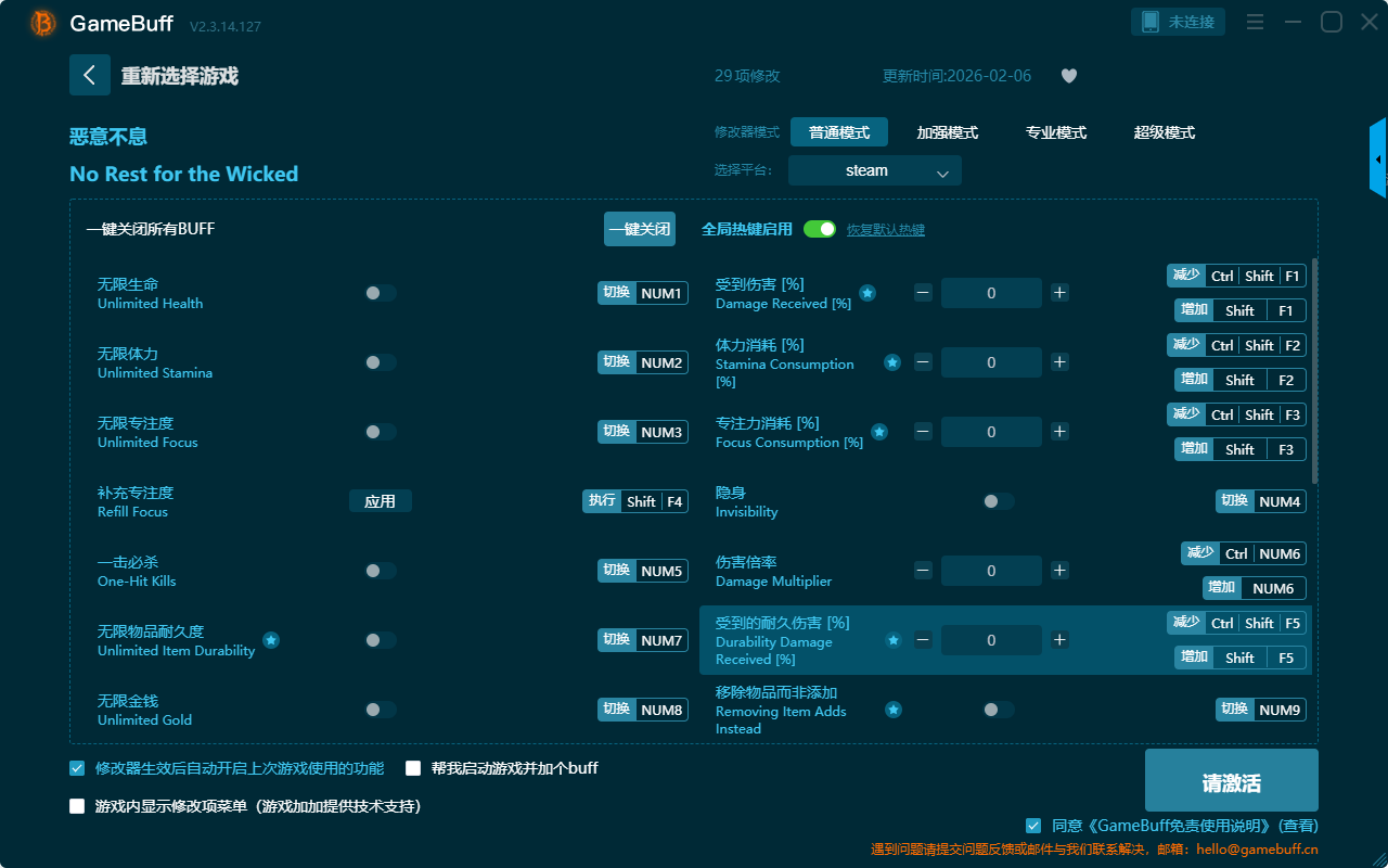 恶意不息二十九项修改器是一款功能强大的游戏辅助修改器工具,根据本身在游戏中遇到的各种困难自由设置拥有无限生命、受到伤害、体力消耗、隐身、伤害倍率、一击必杀、无限专注度、补充专注度、无限金钱、伤害倍率、免费存储、无坠落伤害、移动速度倍率、快速合成等二十九项功能内容,感兴趣的玩家不要错过哦!