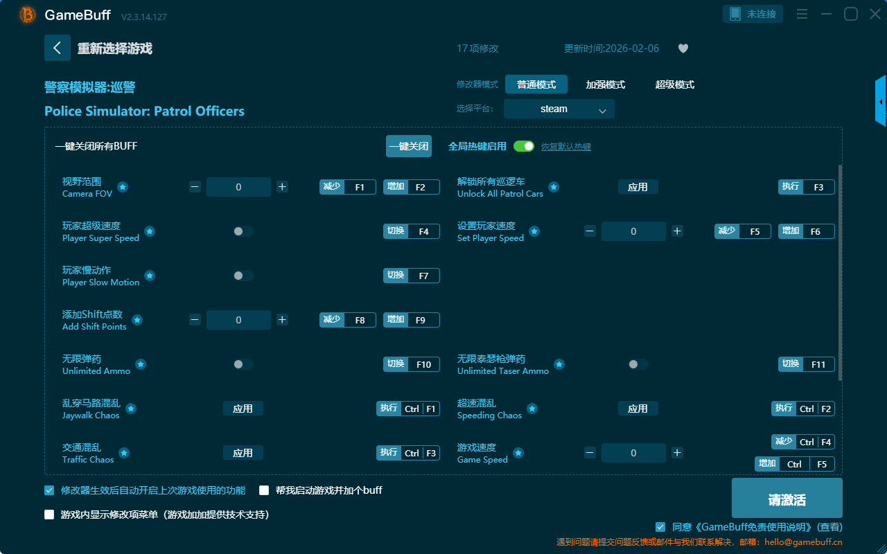 5、等待显示“BUFF加持成功”后,我们就可以在警察模拟器巡警游戏中使用按键来快速激活和关闭对应的修改器功能了。