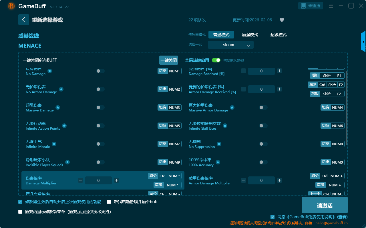 威赫战线二十二项修改器是一款根据本身在游戏中遇到的各种困难与挑战选择一键设置拥有没有伤害、受到伤害、巨大护甲伤害、破甲伤害倍率、无限士气、无限行动点、伤害倍率、隐形玩家小队、显示所有敌人、减少10信任、设置晋升点数、选择属性等二十二项功能内容,感兴趣的玩家不要错过哦!