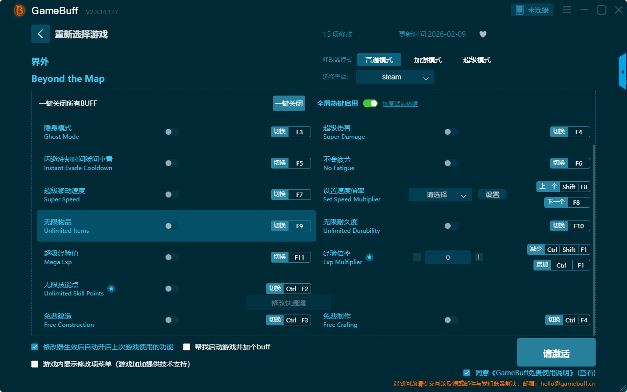 界外十五项修改器是一款操作极其简单的游戏辅助修改器工具,可根据本身在游戏中遇到的各种困难一键设置拥有无限生命、隐身模式、无限魔法、超级伤害、无限耐久度、经验倍率、免费制作、免费建造、无限技能点、超级经验值、闪避冷却时间瞬间重置、设置速度倍率、不会疲劳等十五项功能内容,感兴趣的玩家不要错过哦!