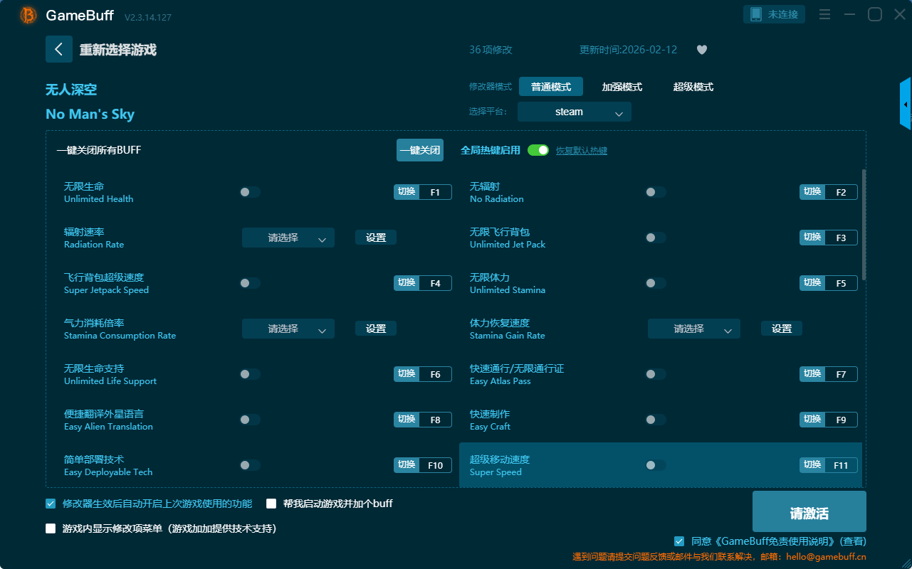 无人深空三十六项修改器是一款操作极其简单的游戏辅助修改器工具,功能强大实用可一键设置拥有无限生命、无辐射、无限飞行背包、无限体力、快速制作、超级移动速度、简单部署技术、辐射速率、气力消耗倍率、无限生命支持、无限单位、无限水银、设置背包大小、设置单位等三十六项功能内容,感兴趣的玩家不要错过哦!