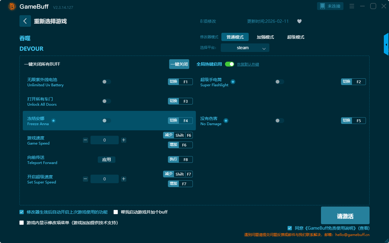 吞噬八项修改器是一款功能强大的游戏辅助修改器,功能强大实用,可一键设置拥有冻结安娜、无限紫外线电池、超级手电筒、打开所有车门、没有损坏、超级移动速度、没有伤害、向前传说、开启超级速度等八项功能内容,感兴趣的玩家不要错过哦!
