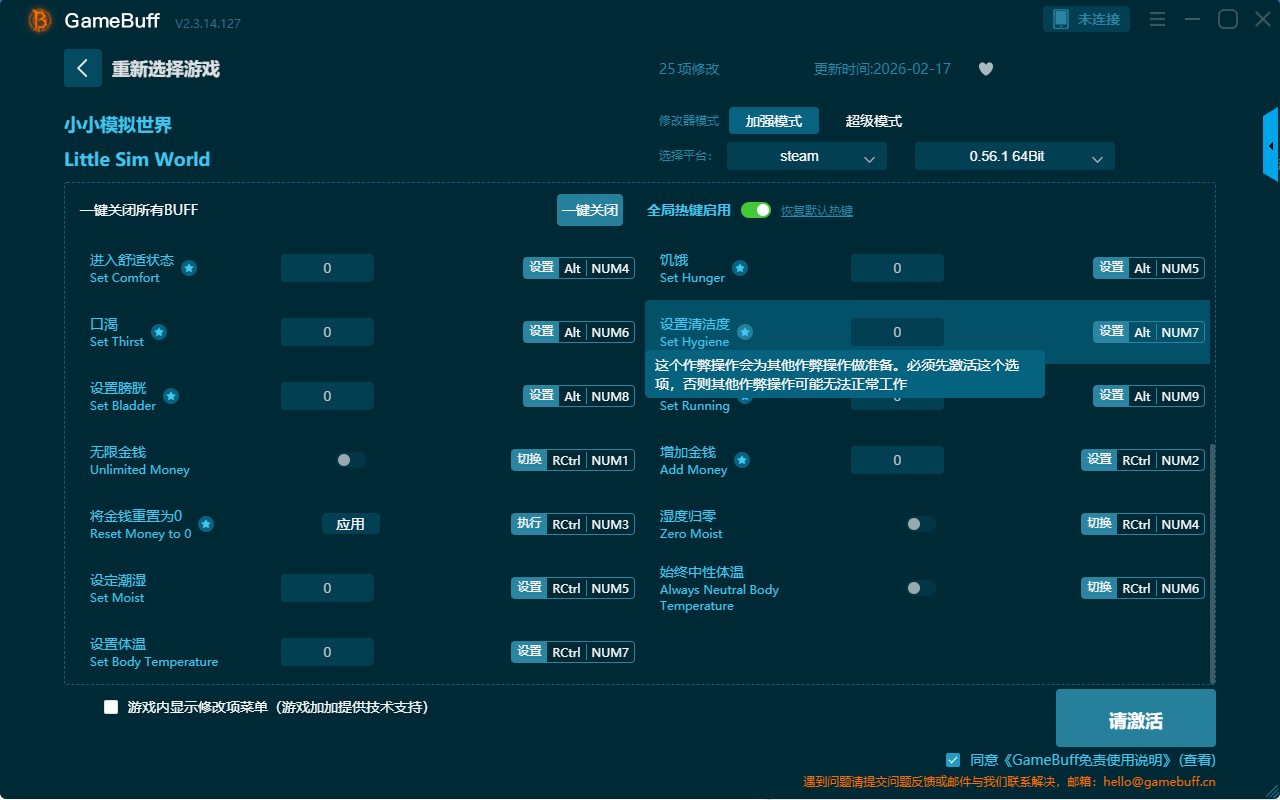 小小模拟世界二十五项修改器是一款功能强大实用的游戏辅助修改器工具,可以设置拥有最大生命值、最高幸福指数、最大卫生、极速奔跑、设定能量、进入舒适状态、最大能量、最大口渴、设置幸福值、饥饿、设置生命值、最大憋气值、无限金钱、口渴等二十五项功能内容,感兴趣的玩家不要错过哦!