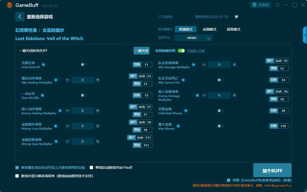 幻灵降世录:女巫的面纱十一项修改器是一款功能强大实用的游戏辅助修改器工具,操作极其简单,可一键设置拥有无限生命、一击必杀、盟友治疗倍率、队友伤害倍率、队友无法死亡、敌人伤害倍率、无限金钱、最大金钱、金钱损失倍率、金钱获取倍率等十一项功能内容,感兴趣的玩家不要错过哦!