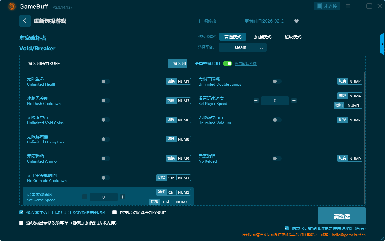 虚空破坏者十一项修改器是一款操作极其简单的游戏辅助修改器工具,可一键设置拥有无限二段跳、无限虚空币、无限弹药、无手雷冷却时间、设置游戏速度、无限生命、冲刺无冷却、设置玩家速度、无限解谜器等十一项功能内容,轻松体验游戏带来的乐趣,感兴趣的朋友不要错过哦!