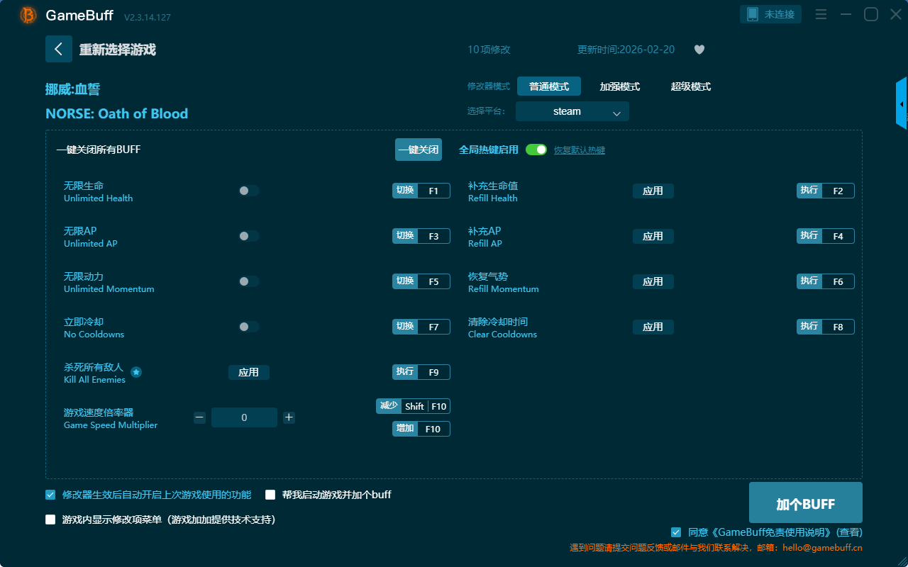 挪威:血誓十项修改器是一款操作极其简单的游戏辅助修改器工具,功能强大实用,可一键设置拥有无限生命、补充生命值、补充AP、恢复气势、清除冷却时间、立即冷却、杀死所有敌人、游戏速度倍率器、无限动力、无限AP等十项功能内容,感兴趣的玩家千万不要错过哦!