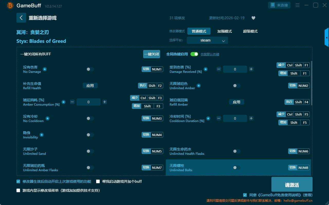 冥河:贪婪之刃三十一项修改器是一款操作极其简单的游戏辅助修改器工具,功能强大实用,可一键设置拥有没有伤害、受到伤害、补充生命值、无限琥珀色、琥珀值回满、琥珀消耗[%]、没有冷却、冷却时间[%]、隐身无限沙子、无限生命药水、无限琥珀药瓶等三十一项功能内容,感兴趣的玩家不要错过哦!