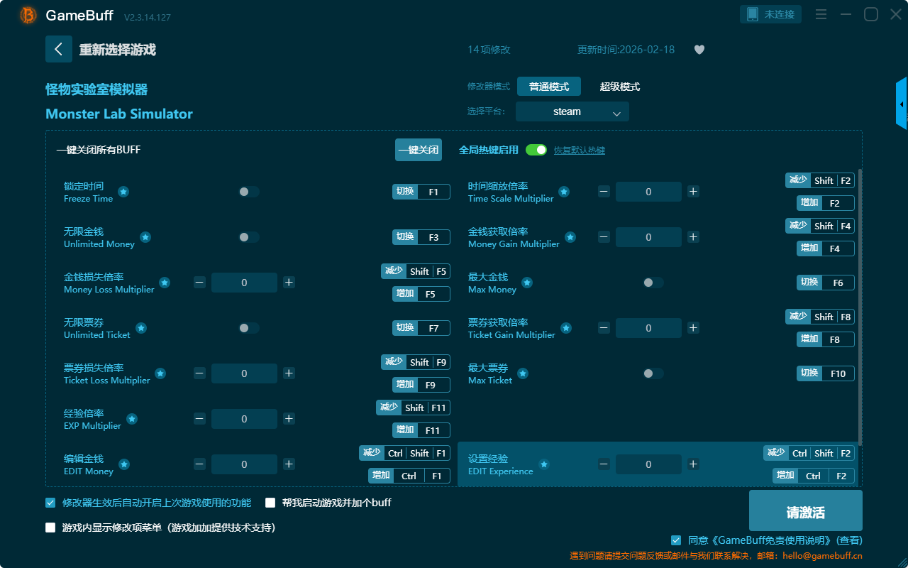 怪物实验室模拟器十四项修改器是一款功能强大的游戏辅助修改器工具,可以根据本身在游戏中遇到的各种困难与挑战一键设置拥有锁定时间、无限金钱、金钱损失倍率、无限票券、票券损失倍率、经验倍率、编辑金钱、时间缩放倍率、金钱获取倍率、最大金钱等十四项功能内容,感兴趣的玩家不要错过哦!
