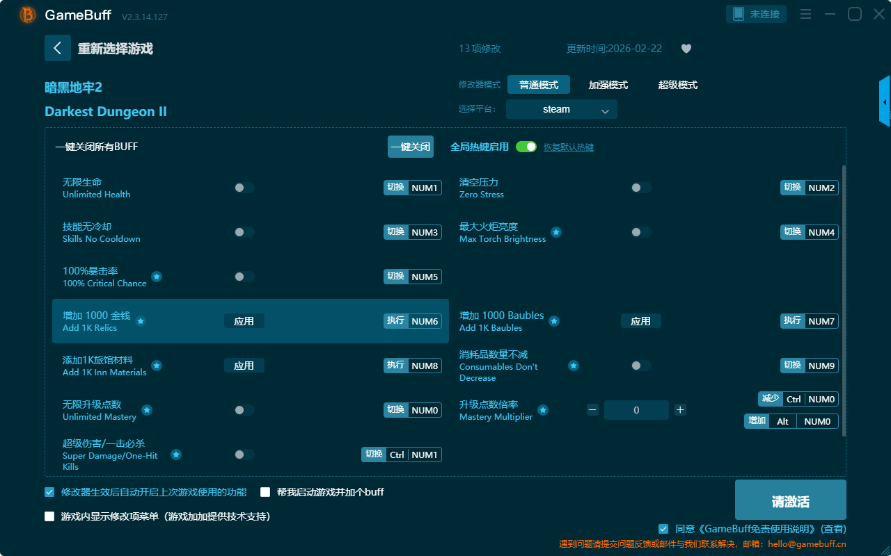 暗黑地牢2十三项修改器免费版是一款可以根据本身在游戏中遇到的各种困难找到最合适的功能进行设置,帮助自己轻松度过难关,包含了无限生命、清空压力、消耗品数量不减、升级点数倍率、无限升级点数、超级伤害、一击必杀、增加1000金钱、100%暴击率等十三项功能内容,感兴趣的玩家不要错过哦!