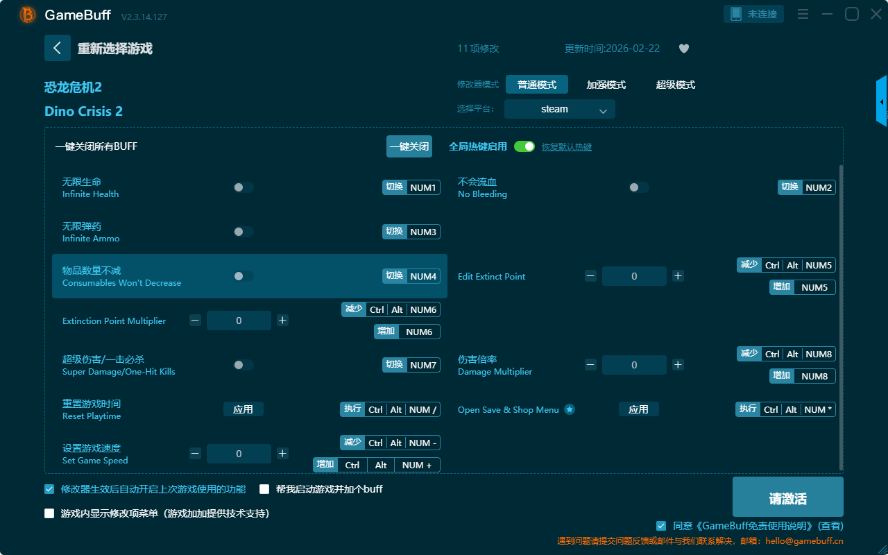 恐龙危机2十一项修改器是一款操作简单易上手的游戏辅助修改器工具,可一键设置拥有一击必杀、超级伤害、无限生命、无限弹药、不会流血、伤害倍率、物品数量不减等十一项功能内容,功能强大实用,帮助玩家解决各种困难与挑战,感兴趣的玩家不要错过哦!