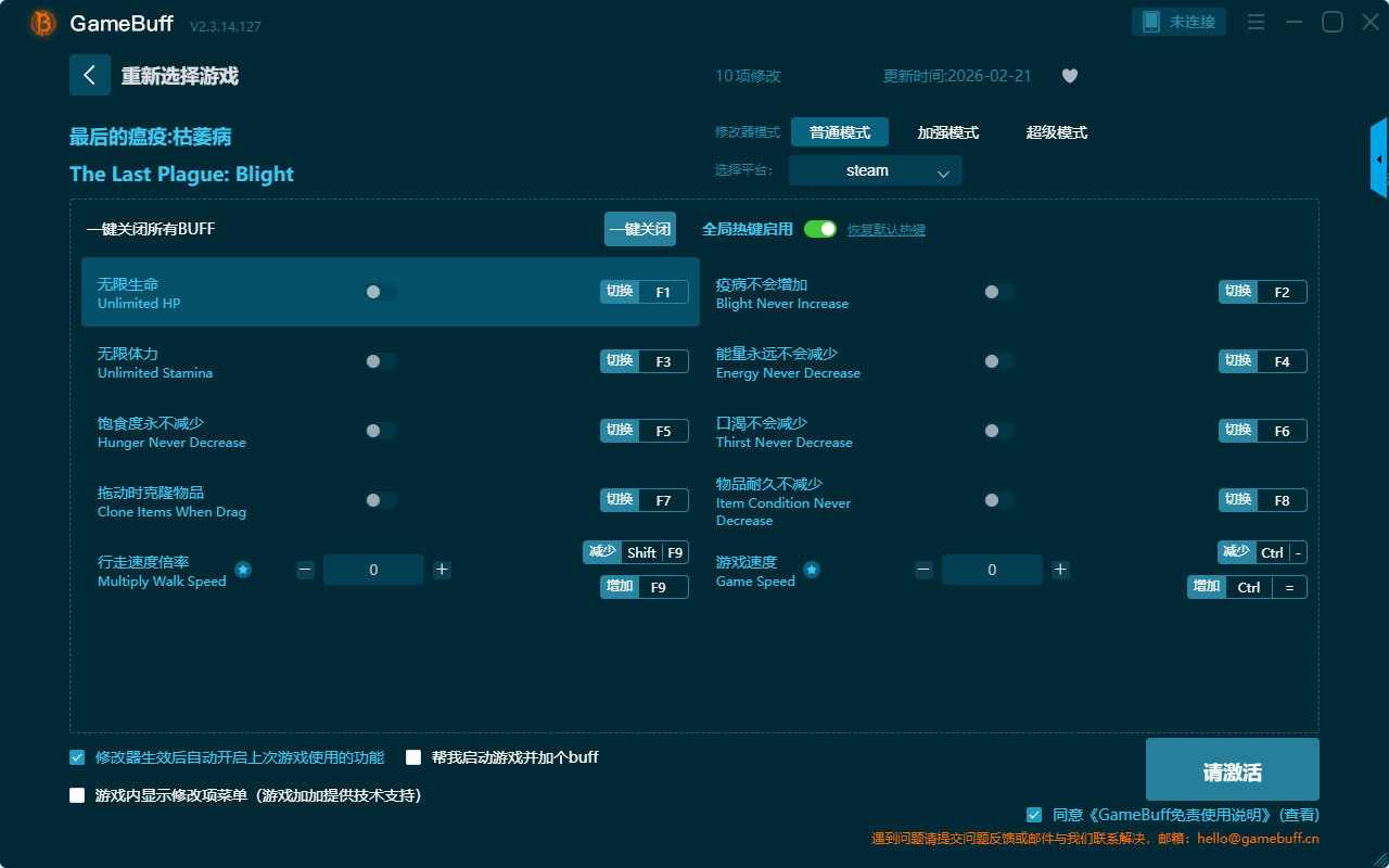 最后的瘟疫:枯萎病十项修改器是一款功能强大的游戏辅助GameBuff工具,操作极其简单,可根据本身在游戏中遇到的困难一键设置拥有无限生命、无限体力、口渴不会减少、物品耐久不减少、游戏速度、行走速度倍率、饱食度永不减少、能量永远不会减少、疫病不会增加、拖动时克隆物品等十项功能内容,感兴趣的玩家不要错过哦!