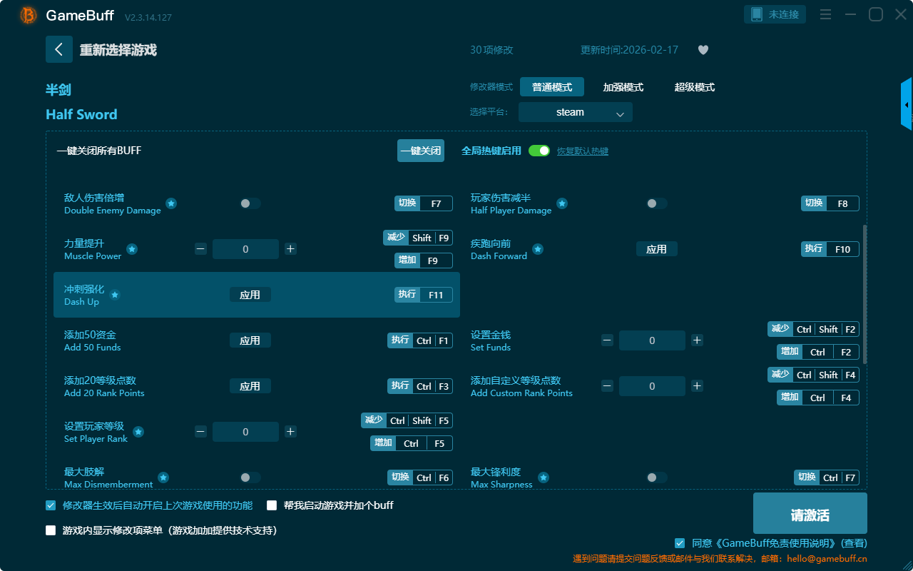 半剑三十项修改器是一款功能强大的游戏辅助修改器工具,可根据本身在游戏中遇到的困难选择设置拥有解除敌人的武装、战斗者重生、设置游戏速度、拾取最近武器、最大锋利度、生成敌人、添加自定义等级点数、无HUD、玩家伤害减半、疾跑向前等三十项功能内容,感兴趣的玩家不要错过哦!