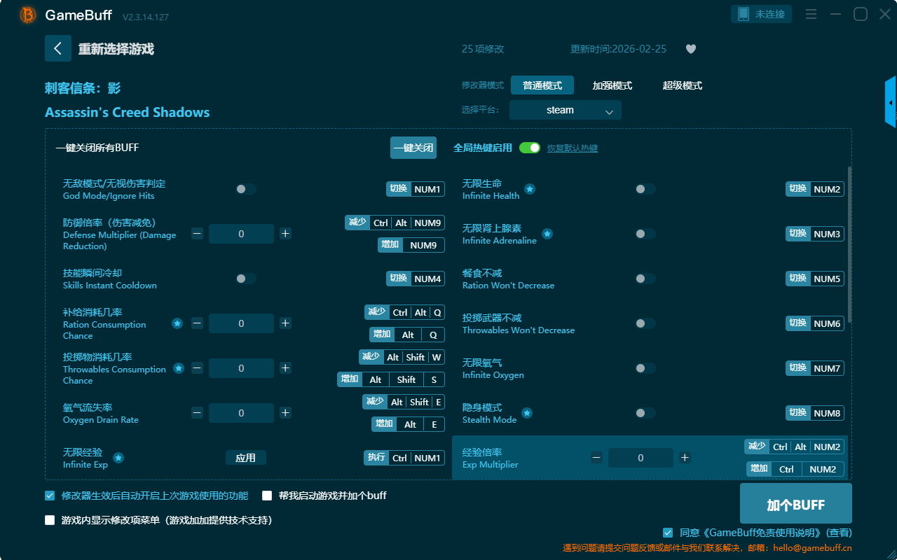 刺客信条:影二十五项修改器是一款操作极其简单的游戏辅助修改器工具,功能强大实用,可一键设置拥有无敌模式、无限生命、餐食不减、无限氧气、隐身模式、经验倍率、无限经验、技能瞬间冷却、补给消耗几率、超级伤害、一击必杀、保存位置、设置游戏速度、传送到保存的位置等二十五项功能内容,感兴趣的玩家不要错过哦!