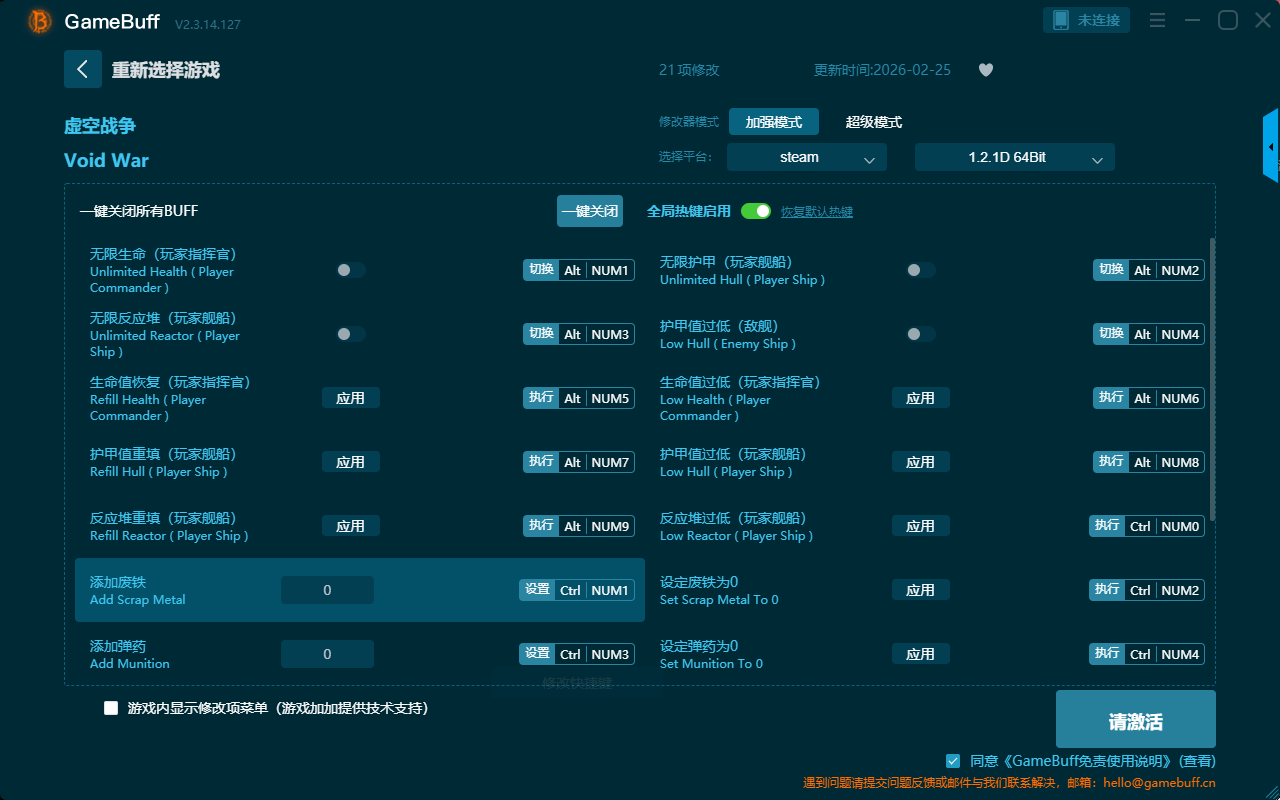 虚空战争二十一项修改器是一款功能强大的游戏辅助修改器工具,根据本身在游戏中遇到的困难自由设置拥有添加废铁、设定废铁为0、设定弹药为0、设定废铁、设定弹药、设定护甲上限、设定反应堆上限、无限生命、生命值恢复、护甲值过低、玩家指挥官等二十一项功能,感兴趣的玩家不要错过哦!