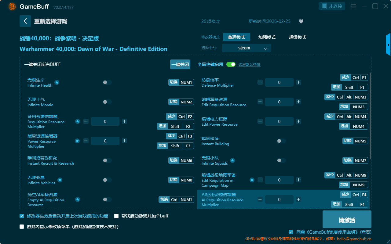 战锤40K:战争黎明终极版二十项修改器是一款操作极其简单的GameBuff修改器工具,可自由设置拥有无限生命、无限士气、无限载具、清空AI军备资源、瞬间招募、瞬间建造、无限小队、防御倍率、编辑军备资源、编辑电力资源、能量资源倍增器等二十项功能内容,感兴趣的玩家不要错过哦!