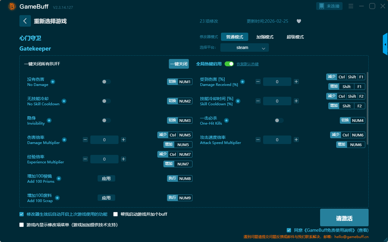 心门守卫二十三项修改器是一款功能强大的游戏辅助修改器工具,操作简单易上手,根据本身在游戏中遇到的困难自由选择设置拥有没有伤害、无技能冷却、受到伤害、一击必杀、技能冷却时间、攻击速度倍率、隐身、伤害倍率、经验倍率、增加100废料、激活所有角色、即时加速、自定义视野等二十三项功能内容,感兴趣的玩家不要错过哦!