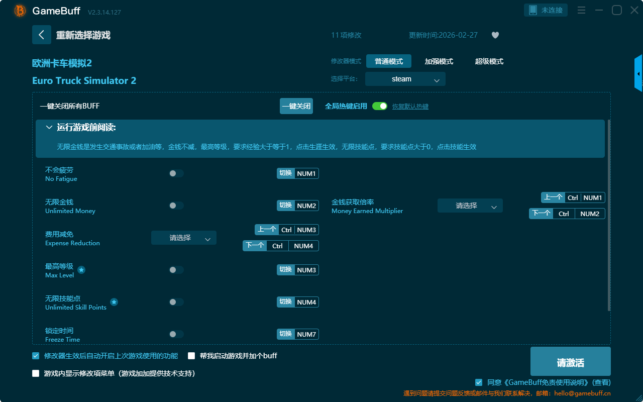 欧洲卡车模拟2十一项修改器是一款功能强大的游戏辅助修改器工具,根据本身在游戏中遇到的困难自由选择设置拥有不会疲劳、无限金钱、费用减免、最高等级、无限技能点、锁定时间、金钱获取倍率、无限燃料、没有伤害等十一项功能内容,轻松享受游戏带来的乐趣与快感,感兴趣的朋友不要错过哦!