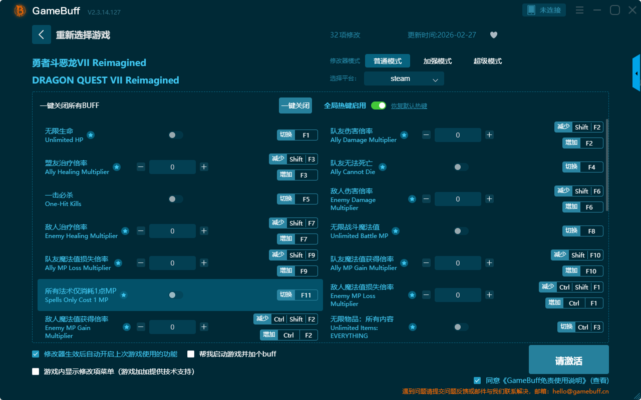 勇者斗恶龙VII三十二项修改器是一款操作极其简单的游戏辅助修改器工具,功能强大实用,支持一键设置拥有无限生命、盟友治疗倍率、一击必杀、敌人治疗倍率、队友魔法值损失倍率、所有法术仅消耗1点MP、敌人魔法值获得倍率、队友伤害倍率、队友无法死亡、敌人伤害倍率、无限战斗魔法值等三十二项功能内容,感兴趣的玩家不要错过哦!