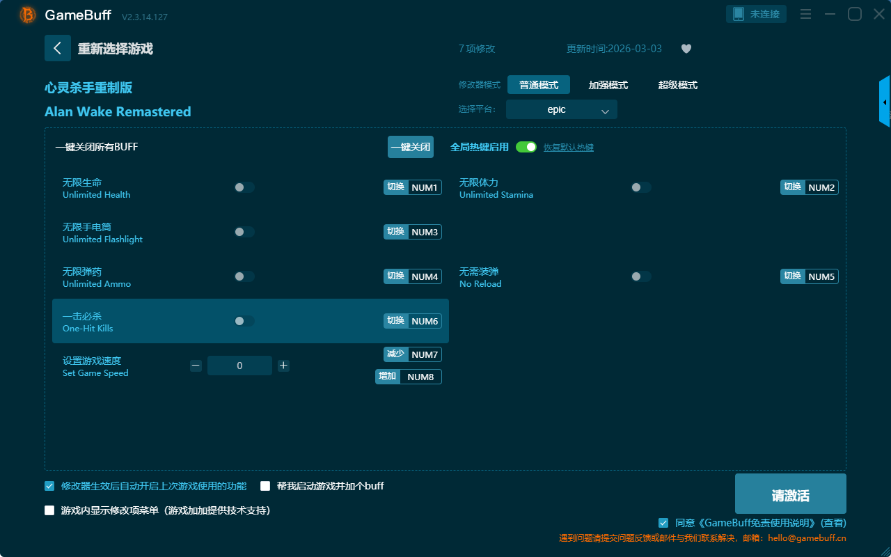 心灵杀手重制版七项修改器是一款操作极其简单的游戏辅助修改器工具,根据本身在游戏中遇到的各种困难自由选择设置拥有无限生命、无限手电筒、无限弹药、一击必杀、设置游戏速度、无限体力、无需装弹等七项功能内容,轻松享受游戏带来的乐趣,感兴趣的玩家不要错过哦!