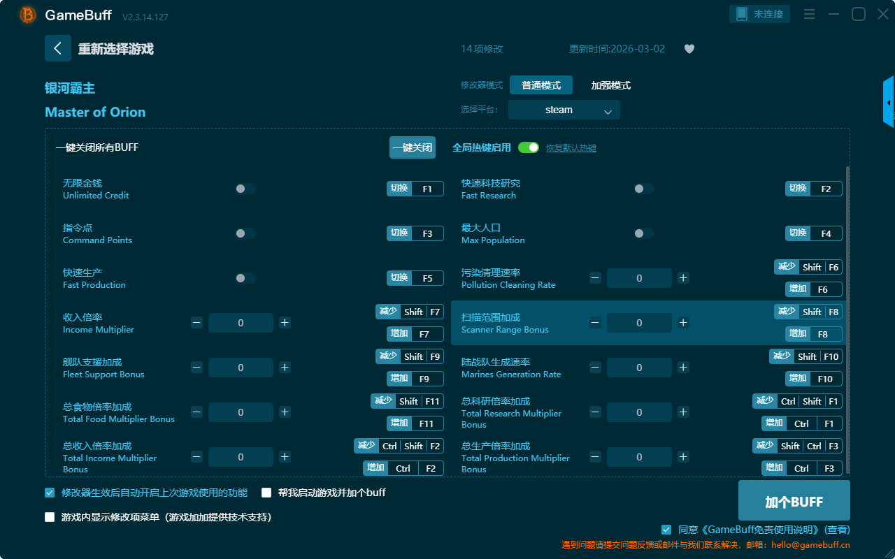 银河霸主十四项修改器是一款功能强大的游戏辅助修改器工具,根据本身在游戏中遇到的困难自由选择设置拥有无限金钱、最大人口、快速科技研究、快速生产、收入倍率、扫描范围加成、污染清理速率、总科研倍率加成、总生产倍率加成、总食物倍率加成等十四项功能内容,感兴趣的玩家不要错过哦!