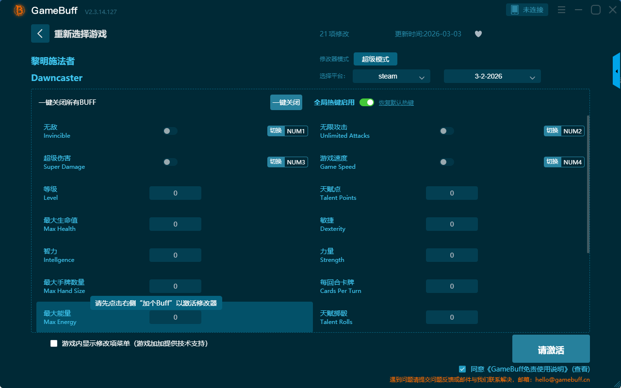 黎明施法者二十一项修改器是一款操作极其简单的游戏辅助修改器工具,功能强大实用,根据本身的需求自由选择设置拥有无敌、超级伤害、等级、最大生命值、智力、最大手牌数量、最大能量、无限攻击、游戏速度、天赋点、敏捷等二十一项功能内容,感兴趣的玩家不要错过哦!