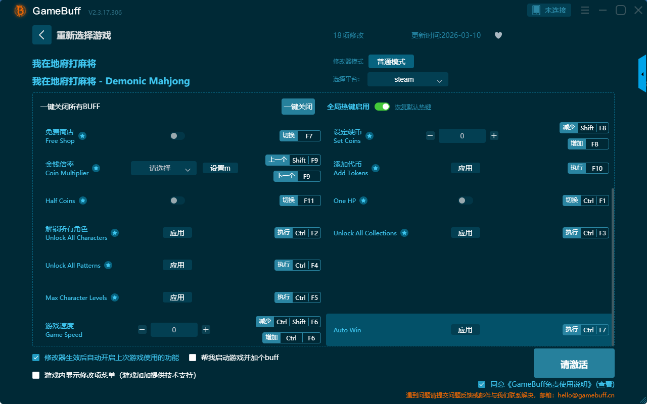 我在地府打麻将十八项修改器是一款操作极其简单的游戏辅助修改器工具,功能强大实用可一键设置拥有无敌模式、设置最大生命值、免费商店、金钱倍率、解锁所有角色、设置HP、无限灵魂、设定硬币、添加代币等十八项功能内容,感兴趣的玩家不要错过哦!