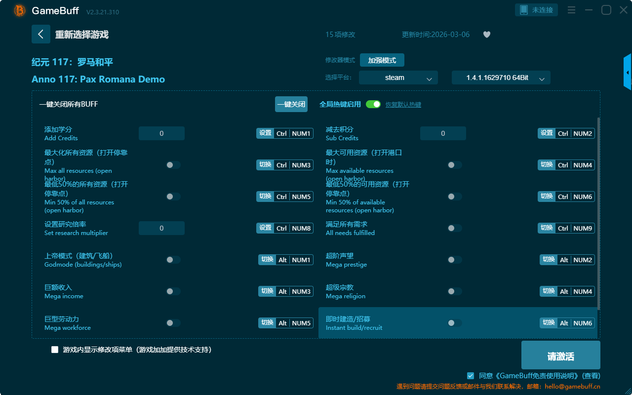 纪元117:罗马和平十五项修改器是一款操作极其简单的游戏辅助修改器工具,功能强大实用,可一键设置拥有添加学分、减去积分、超阶声望、即时建造、即时招募、巨额收入、上帝模式、设置研究倍率、巨型劳动力、最大积分、最大可用资源等十五项功能内容,感兴趣的玩家千万不要错过哦!