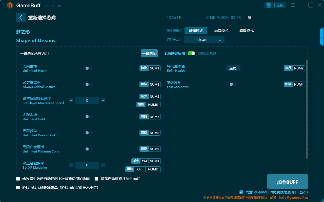 梦之形十三项修改器是一款操作简单易上手的游戏辅助修改器工具,功能强大实用,根据本身的需求自由选择设置用于无限生命、补充生命、必定暴击率、设置玩家移动速度、无限金钱、无限梦尘、设置经验倍率、无限白金硬币等十三项功能内容,感兴趣的玩家千万不要错过哦!