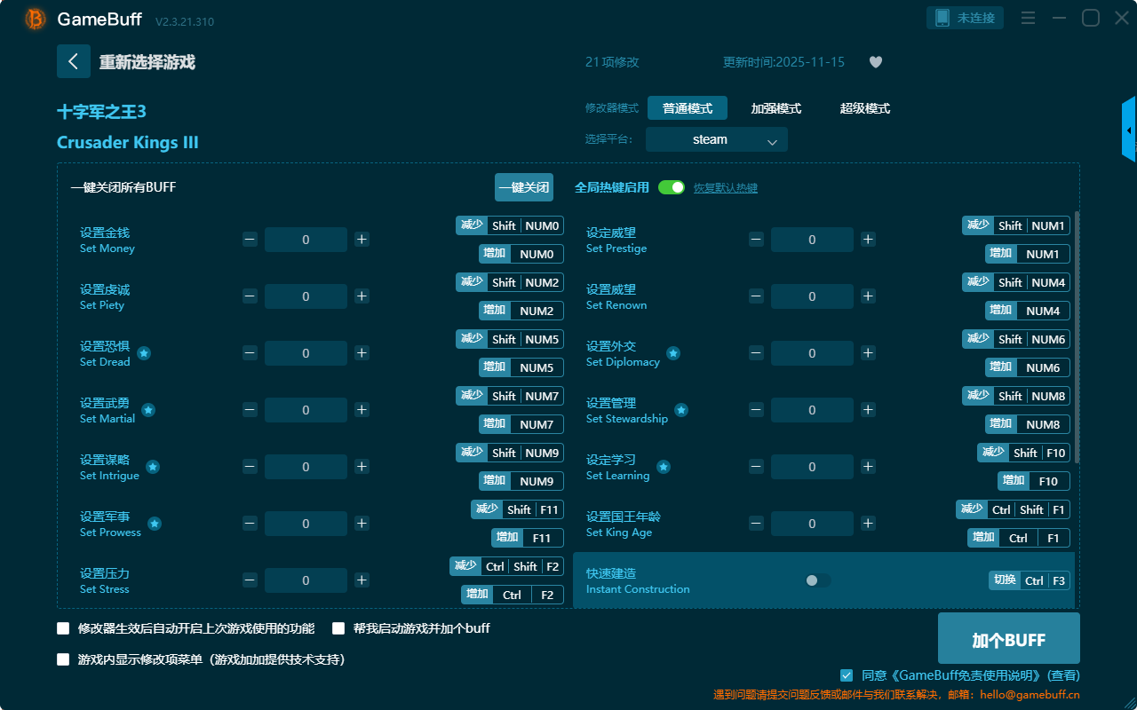 十字军之王3二十一项修改器是一款操作极其简单的游戏辅助修改器工具,功能强大实用,根据本身在游戏中遇到的困难自由选择设置金钱、设定威望、设置虔诚、设置恐惧、设置武器、设置管理、设置外交、设置国王年龄、快速建造、设置压力、设置军事、设定学习等二十一项功能内容,大家千万不要错过哦!