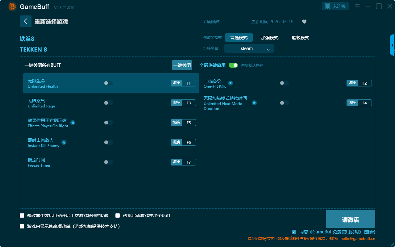 铁拳8七项修改器是一款功能强大的游戏辅助修改器工具,根据本身在游戏中遇到的困难自由设置拥有无限生命、一击必杀、无限怒气、即时击杀敌人、锁定时间、效果作用于右侧玩家、无限加热模式持续时间等七项功能内容,沉浸式享受游戏的乐趣,大家千万不要错过哦!