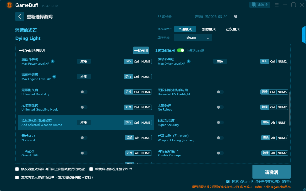 消逝的光芒三十八项修改器是一款操作极其简单易上手的游戏辅助修改器工具,功能强大实用,支持一键设置拥有无限生命、无限体力、最高体力、无限投掷物、快速合成、减少5000金钱、满生存等级、补充生命值、补充体力、快速开锁、无限物品、增加5000金钱、设置金钱、满敏捷等级、满传奇等级等功能内容,大家千万不要错过哦!