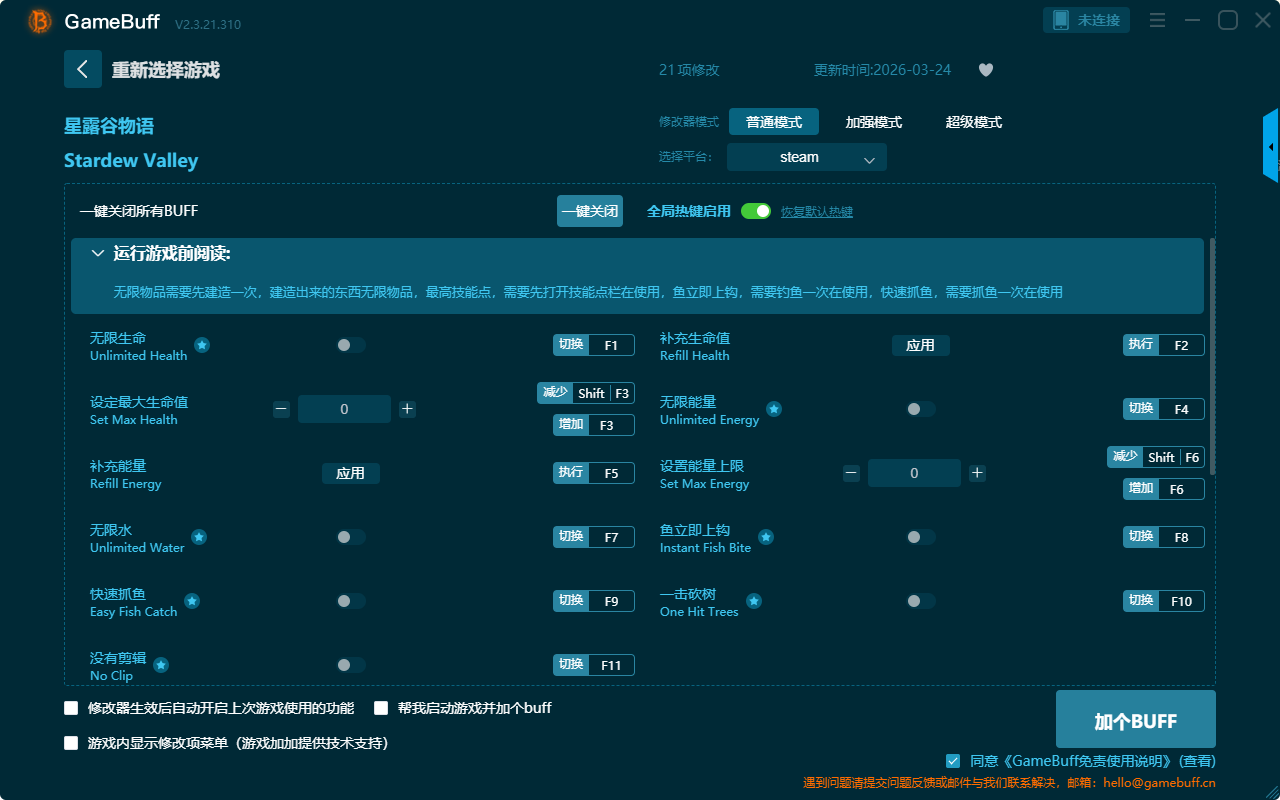 星露谷物语二十一项修改器是一款操作极其简单的游戏辅助修改器工具,功能强大实用,可一键设置拥有无限生命、设定最大生命值、补充能量、无限水、快速抓鱼、没有剪辑、补充生命值、无限能量、设置能量上限、鱼立即上钩、一击砍树、无限金钱等二十一项功能内容,大家不要错过哦!