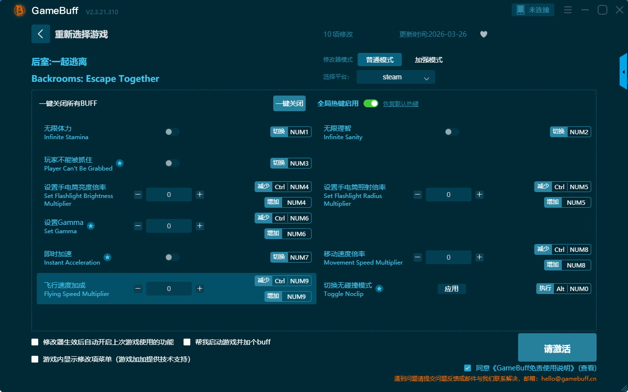 后室:一起逃离十项修改器是一款操作极其简单的游戏辅助修改器工具,功能强大,可根据本身在游戏中遇到的困难自由选择设置拥有无限体力、玩家不能被抓住、设置手电筒亮度倍率、设置Gamma、即时加速、飞行速度加成、无限理智、设置手电筒照射倍率、移动速度倍率、切换无碰撞模式等十项功能内容,大家千万不要错过哦!