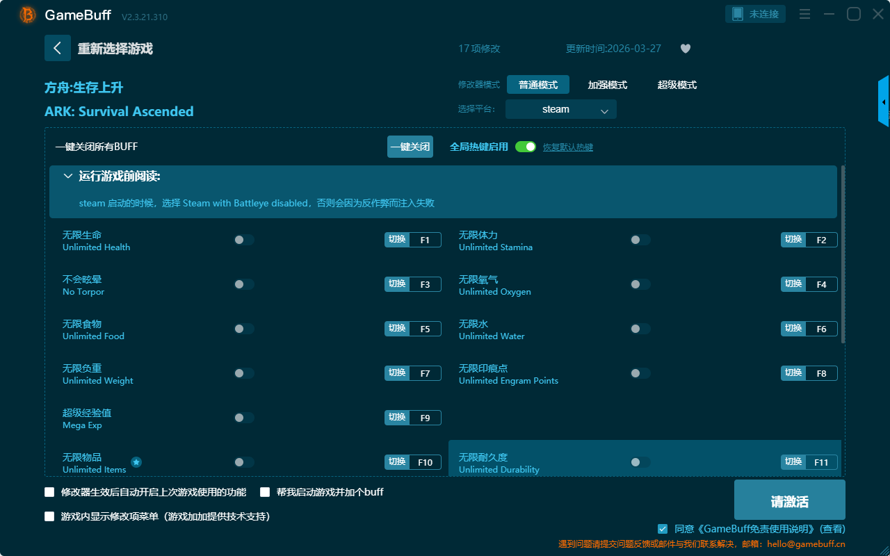 方舟:生存上升十七项修改器是一款操作极其简单的游戏辅助修改器工具,功能强大实用根据本身遇到的困难自由选择设置无限生命、无限体力、无限氧气、无限水、无限耐久度、无限物品、超级经验值、不会眩晕、物品不会腐烂、快速制作、设置重力等十七项功能内容,感兴趣的朋友不要错过哦!