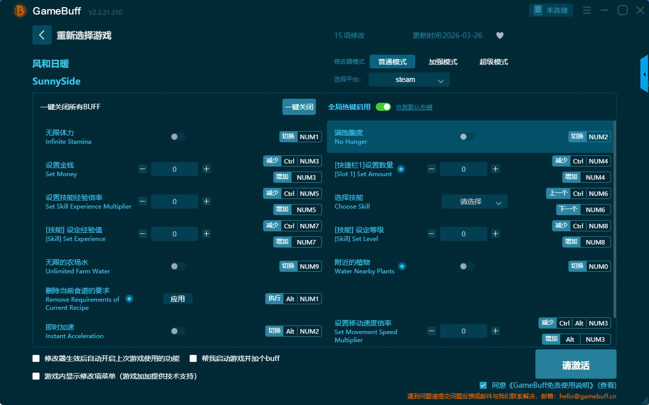 风和日暖十五项修改器是一款功能强大的游戏辅助修改器工具,根据本身遇到的困难自由选择设置无限体力、设置金钱、设置技能经验倍率、[技能]设定经验值、无限的农场水、删除当前食谱的要求、即时加速、满饱腹度、[快捷栏1]设置数量、选择技能、[技能]设定等级等十五项功能内容,大家不要错过哦!